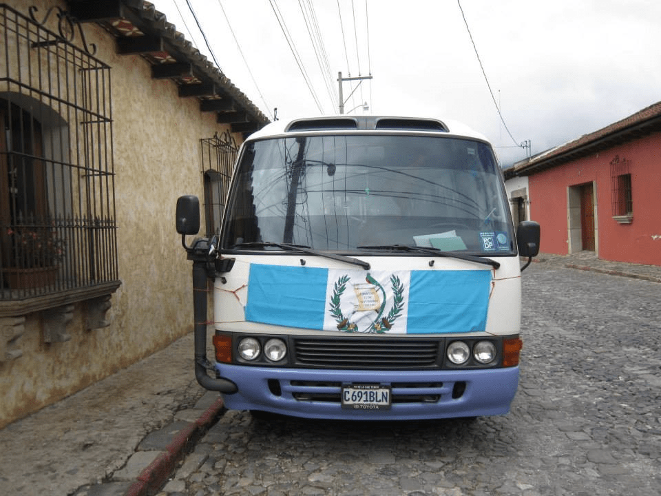 Proudly displaying the national flag on a passenger bus in Antigua Guatemala.