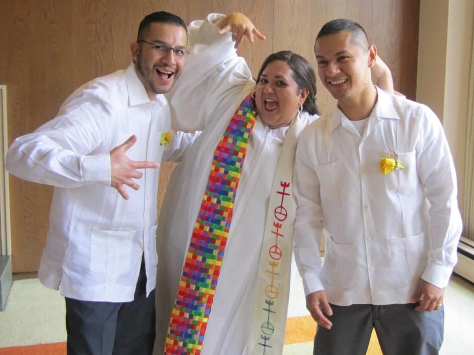 My husband and I on our wedding day with our friend, the Rev. Thea Racelis, wearing our respective traditional guayaberas.